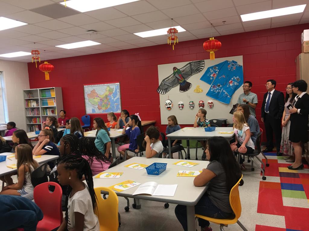 2017年8月11日,中国驻休斯顿总领馆教育组李卫东和陈默两位领事专程来到特洛伊大学孔子学院,以实地走访和交流座谈的形式开展调研。早上九点,调研组一行就前往Pike Road学校,了解设于该校的孔子课堂的运行情况并观摩了一堂四年级的中文课程。当了解到,这所从幼儿园到高中的一贯制学校,共有1300多人选修中文课程时,两位领事都称赞不已。随后,调研组来到阿州首府蒙哥马丽市,先后走访了美国公立高中排名前十五名的LAMP高中和荣膺美国“蓝带学校”称号的ForestAvenue小学,并与在学校任教的当地中文教师进行了深入的交流。两位领事欣喜的看到,在LAMP高中,孔子课堂搬进了漂亮的新教学楼,本学期选修中文课程的高中生占全校总人数的十分之一强;在ForestAvenue小学,孔子课堂深受孩子们的喜爱,三到五年级共有390人选修中文。