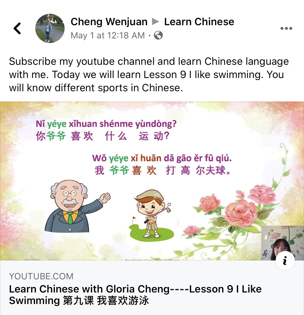 “跟着Gloria学汉语”是程文娟老师Youtube在线汉语课程,对象为汉语初学者。课件定位及教学目标明确,教学内容丰富多彩,将汉语学习与日常生活紧密结合在一起,极大地激发了学习者学习汉语的兴趣,短短的一个月时间,上线学习人数近3000人。