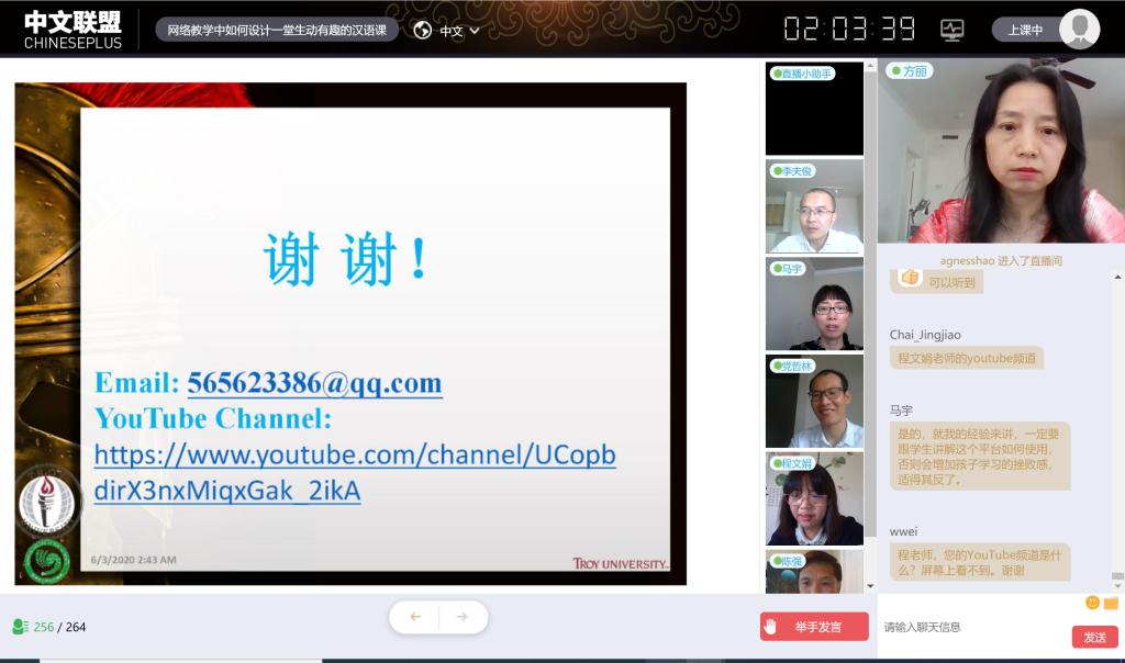 特洛伊大学孔院访问学者程文娟老师、马宇老师、李夫俊老师和党哲林老师在资深美国汉语教师陈强老师主讲的《网络教学中如何设计一堂生动有趣的汉语课?》工作坊中,结合自己海外汉语教学的实践,与大家分享了线上教学的经验。同时,方丽老师、姜娜老师担任了两场工作坊的直播助理。