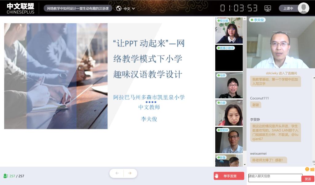 李夫俊老师凭借自己多年的海外汉语教学经验,深得学生们的喜爱。李老师在特洛伊大学孔院下属孔子课堂多森(Dothan)市凯丽泉(KellySpring)公立小学分享汉语言文化,此次和大家交流的主题是《让PPT动起来——网络教学模式下小学趣味汉语教学设计》。李老师首先从面对疫情汉语课教学形势的变化,提出了趣味性在网络汉语教学中的重要性,他用大量的在线教学案例,从设计前准备、选取素材和方法、设计、教学设计应用、收集反馈和反思改善教学设计六个方面阐述了在线教学如何体现趣味性,同时还讲授了如何让PPT动起来,成为提升教学趣味性的工具。