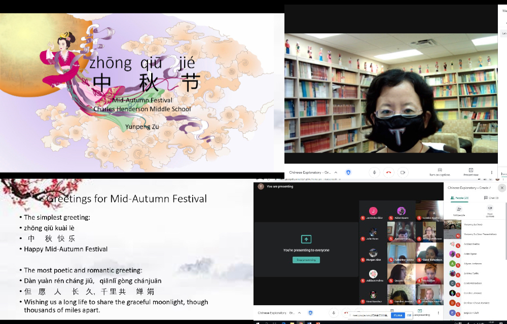 孔子学院下设孔子课堂查尔斯.汉德森中学(Charles Henderson Middle School)、以及各个教学点进行了在线中秋庆祝活动。孔子学院老师们通过在线听“嫦娥奔月”、“后羿射日”等民间故事、学习中秋节的来历、中秋民间传统习俗、中秋祝福语、制作月饼等丰富多彩的活动与学生们一起共度佳节。