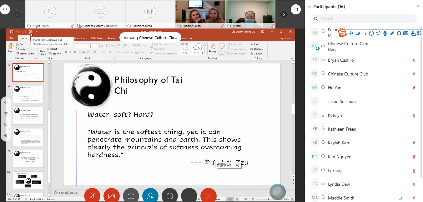 在线太极文化系列活动第一部分为太极文化知识讲座。孔子学院老师何艳在讲座中对太极拳的历史,太极拳的哲学及文化内涵,太极拳的特点和门派等进行了详细的介绍,极大地激发了听众学习太极拳的兴趣。