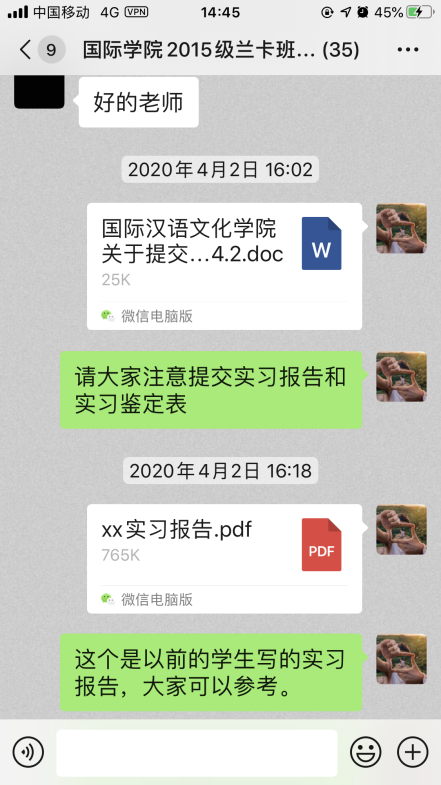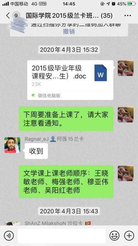 本学年毕业学生主要包括孔子学院总部南亚国家汉语师资班项目斯里兰卡学生和印度尼西亚“2+2”项目学生。学院召集各年级联络老师召开视频、微信会议,围绕线上教学、重修补考、实习总结、毕业论文、毕业审核等内容进行了专题讨论,研究制定了毕业年级教学工作预案和毕业生工作各项应急预案。同时,各班级联络老师又召集本班同学做了进一步的沟通和交流。在此基础上,学院先后在教师工作群、学生微信群发布相关通知、方案,沟通毕业年级的教学工作。