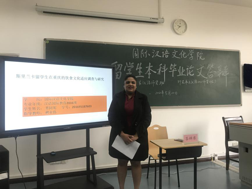 答辩结束后,留学生们向老师表达了感激之情,感谢老师们的悉心指导,也衷心感谢学校的精心培养。来自斯里兰卡的南亚汉语师资班留学生基阿妮是唯一的线下答辩学生,她说因为疫情的原因没有回国,虽然很想念父母、家人,但能在中国学习和生活也是一种幸福,她收获了老师们的关爱,收获了对中国文化更深地理解。另有一名同学因为疫情和网络影响,在当地医院向答辩组提交了论文陈述语音文件,并尽力连线实时完成了提问答辩环节。答辩组老师们也称赞同学们克服疫情影响带来的各种困难,顺利完成了毕业论文写作和答辩,同时希望同学们不断努力,砥砺前行,毕业后运用所学,实现理想。