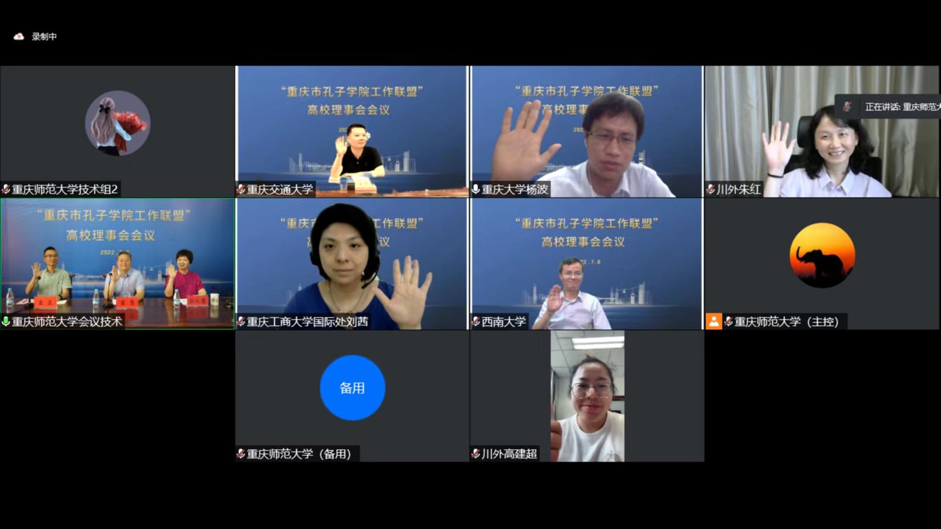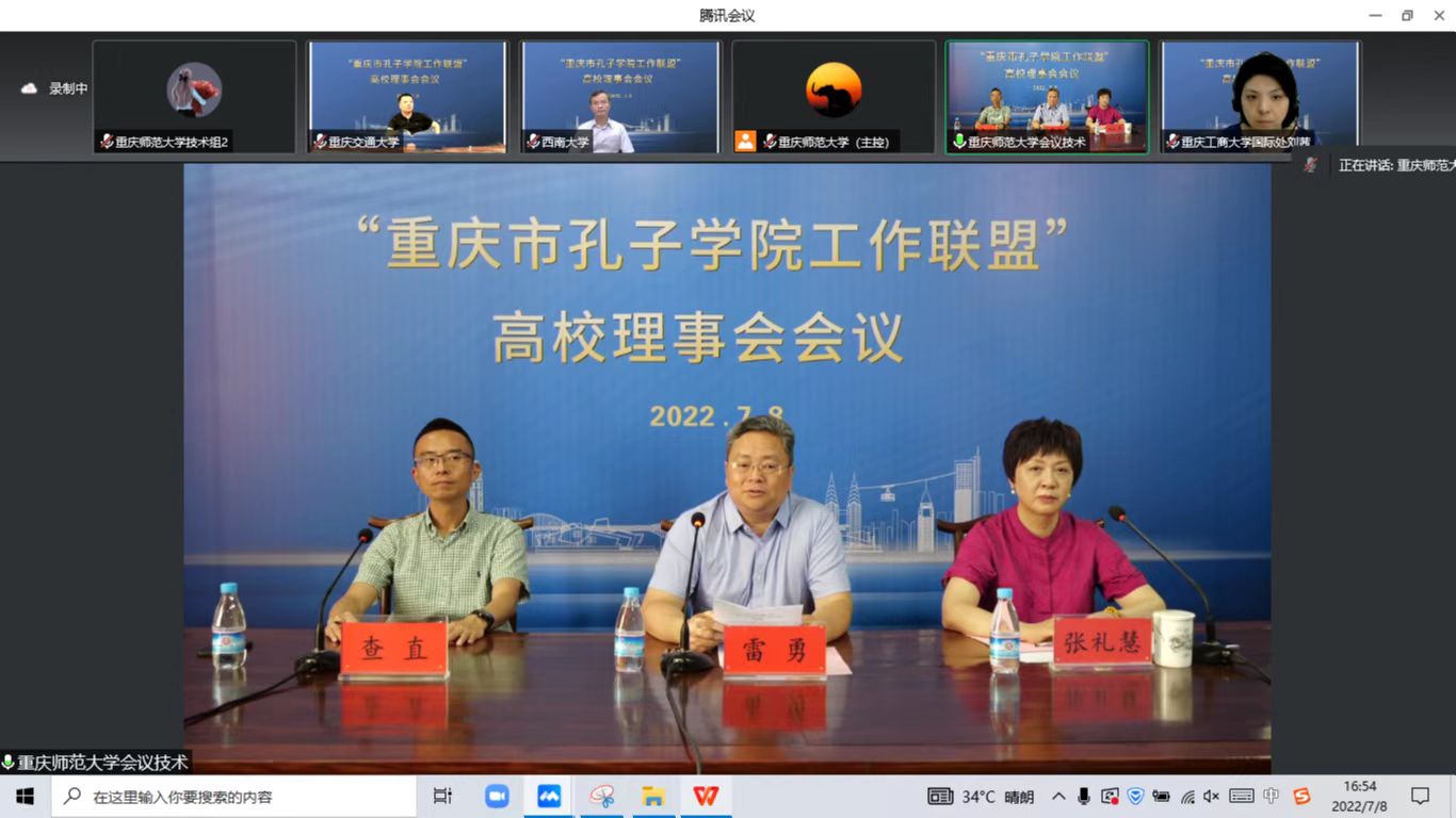为推进重庆市高校孔子学院(国际中文教育)事业发展,值“重庆市孔子学院工作联盟”成立四周年之际,在重庆市教育委员会支持下,“重庆市孔子学院工作联盟”高校理事会于7月8日下午在云端顺利召开。出席会议人员是高校从事孔子学院(国际中文教育)相关职能部门负责人,分别来自重庆大学、西南大学、西南政法大学、四川外国语大学、重庆交通大学、重庆工商大学、四川美术学院、mansion88主页等8所高校理事单位。我校mansion88主页院长张礼慧、国际合作与交流处查直处长出席会议。受联盟理事长单位-mansion88主页孟东方校长委托,本次会议由联盟秘书长、mansion88主页雷勇教授主持。