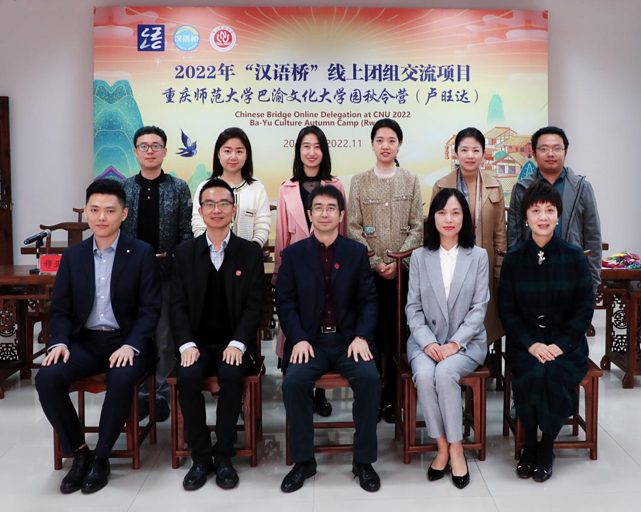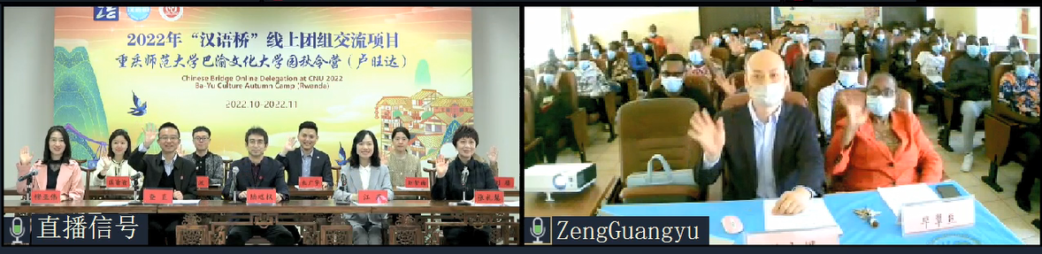 10月27日下午,学校2022年“汉语桥线上组团交流项目——“巴渝文化大学园”秋令营(卢旺达)在云端顺利开营。mansion88主页副校长陆远权教授、重庆市教育委员会国际处副处长江燕、mansion88主页国际合作与交流处处长查直、卢旺达大学孔子学院中方院长曾广煜、外方院长碧翠丝以及来自卢旺达孔院的71名营员及领队老师在云端参加了开营仪式。