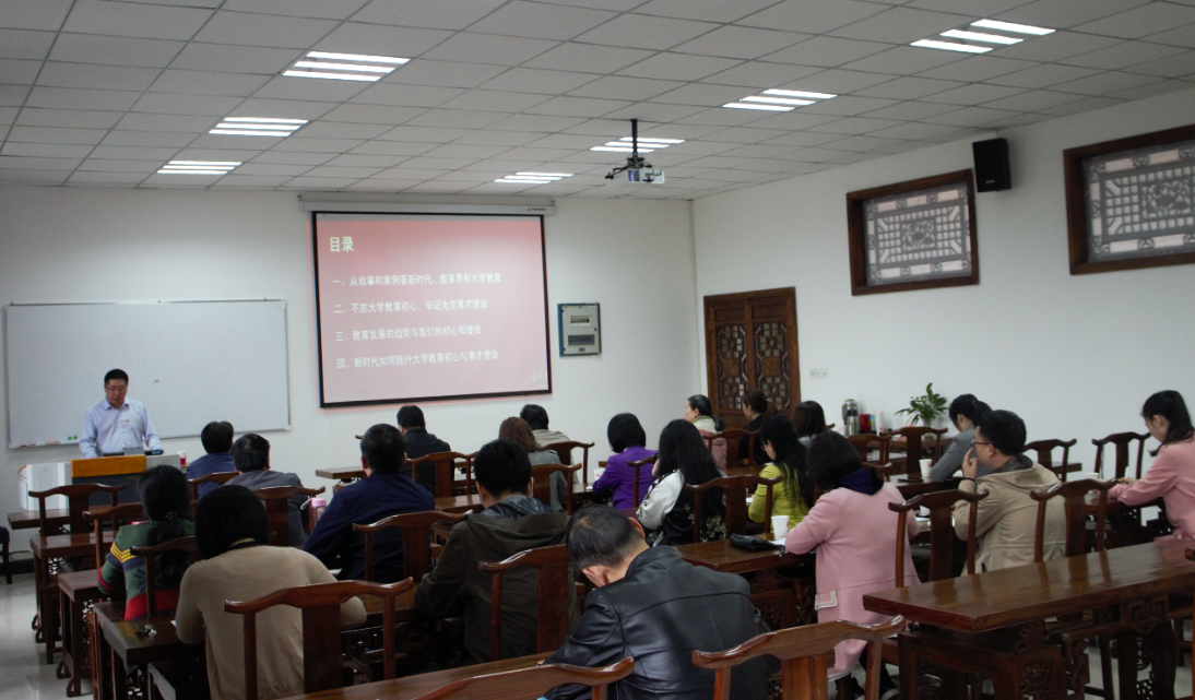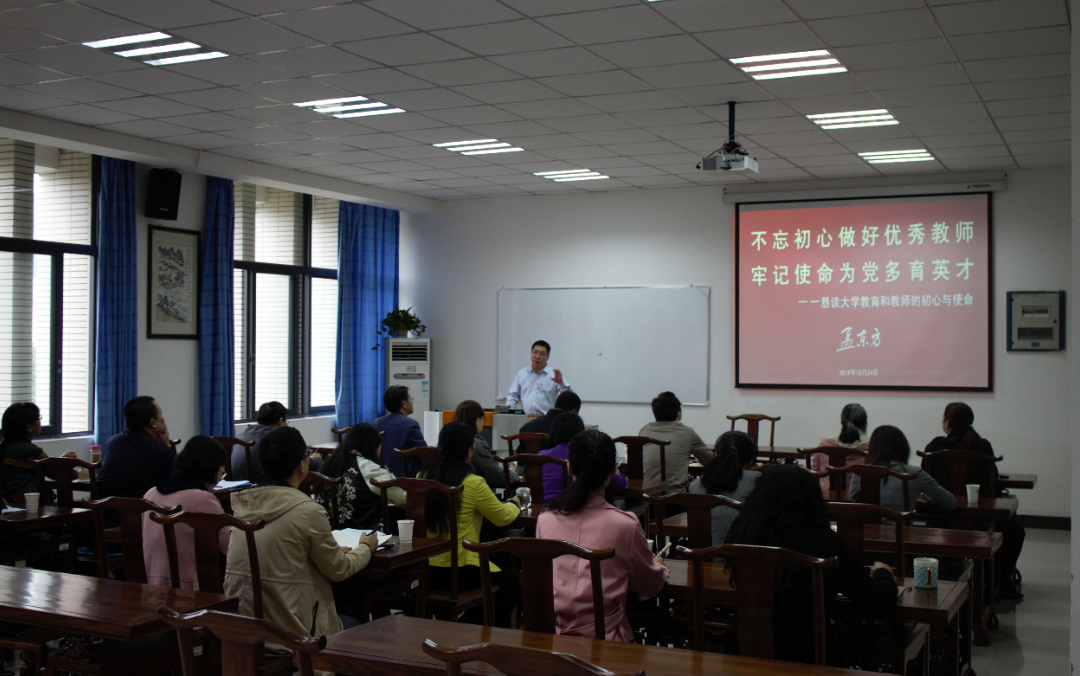 孟东方校长以“不忘初心做好优秀教师,牢记使命为党多育英才”为主题,从四个方面作了深入讲解和阐述:一、从故事和案例看新时代、教育界和大学教育;二、不忘大学教育初心,牢记为党育才使命;三、教育发展的趋势与我们的初心和使命;四、新时代如何践行大学教育初心与育才使命。孟校长最后将践行教育初心与使命落脚到推动学校发展的四无精神:无悔的选择、无私的奉献、无畏的勇气与毅力、无止境的探索,号召高校的教育工作者要秉持智能教育、终身教育、通才教育、管理教育的精神,要做学生的“人师”,切实落实习近平总书记提出的立德树人根本任务。