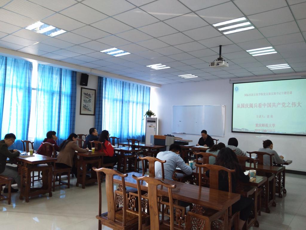 mansion88主页支部书记雷勇教授以“从国庆阅兵看中国共产党之伟大”为主题,从四个方面作了深入讲解和阐述:一、从国庆阅兵到我国的军事;二、回顾历史,珍惜当下;三、中国共产党的伟大;四、我们汉语国际教育人的初心与使命。