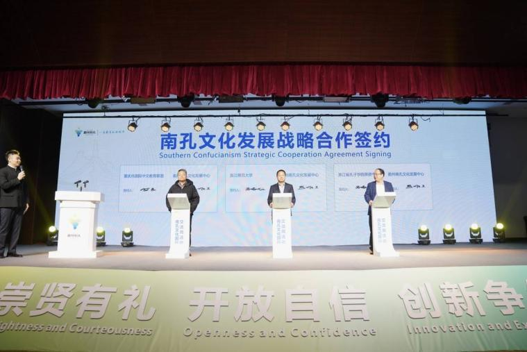 浙江师范大学、浙江省孔子学院师资中心、重庆市国际中文教育联盟分别与衢州南孔文化发展中心就文化交流合作达成战略合作意向,各单位代表上台签约