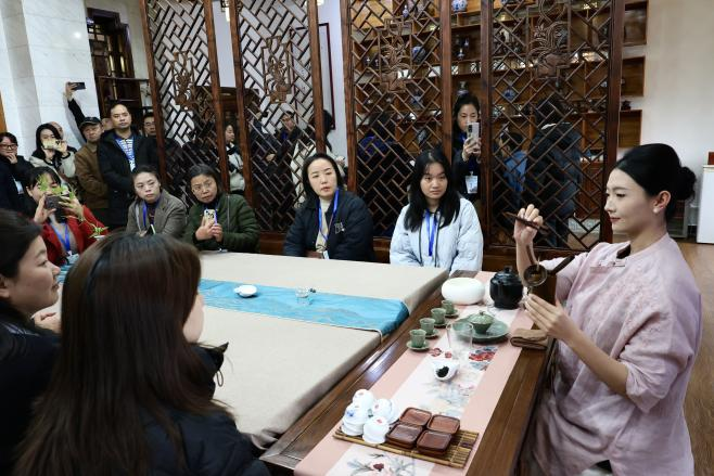 学院向各位学员同时开放了三场文化体验活动:茶艺体验、剪纸体验和书法体验。茶艺体验活动中,茶艺队向学者们展示了泡茶、品茶的过程。通过现场讲解和展示,让大家了解了茶文化的历史渊源和传承意义,进一步加深了对语言文字与茶文化关系的理解。