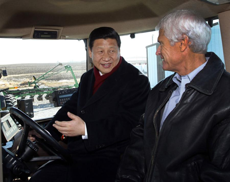 2012年2月16日,时任中国国家副主席的习近平在美国金伯利农场参观。这是习近平在农场主金伯利的陪同下操作其农用机械。新华社记者兰红光摄