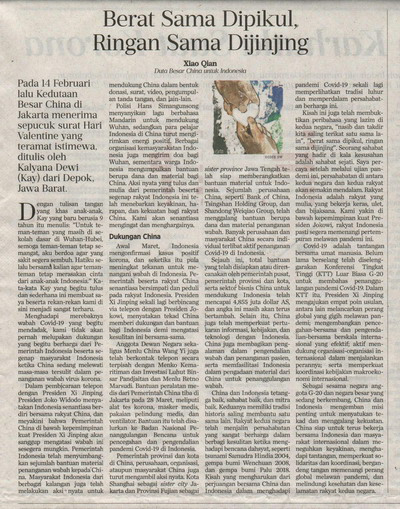 2020年4月9日,驻印度尼西亚大使肖千在印尼发行量最大报纸《罗盘报》评论版和网络版同时发表题为《命运相连 休戚与共》的署名文章,讲述中印尼守望相助、携手抗疫的感人故事,介绍习近平主席在二十国集团领导人应对新冠肺炎特别峰会上提出的重要主张,呼吁中印尼同国际社会一道,坚定信心、团结合作,携手打赢全球抗疫阻击战。文章全文如下: