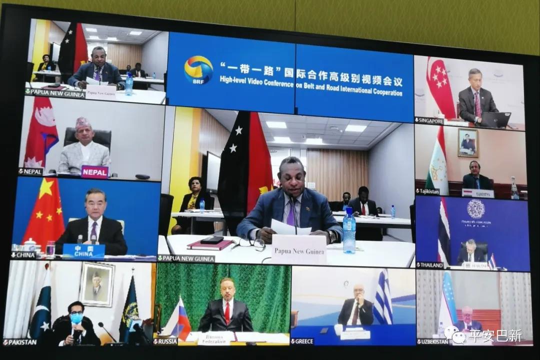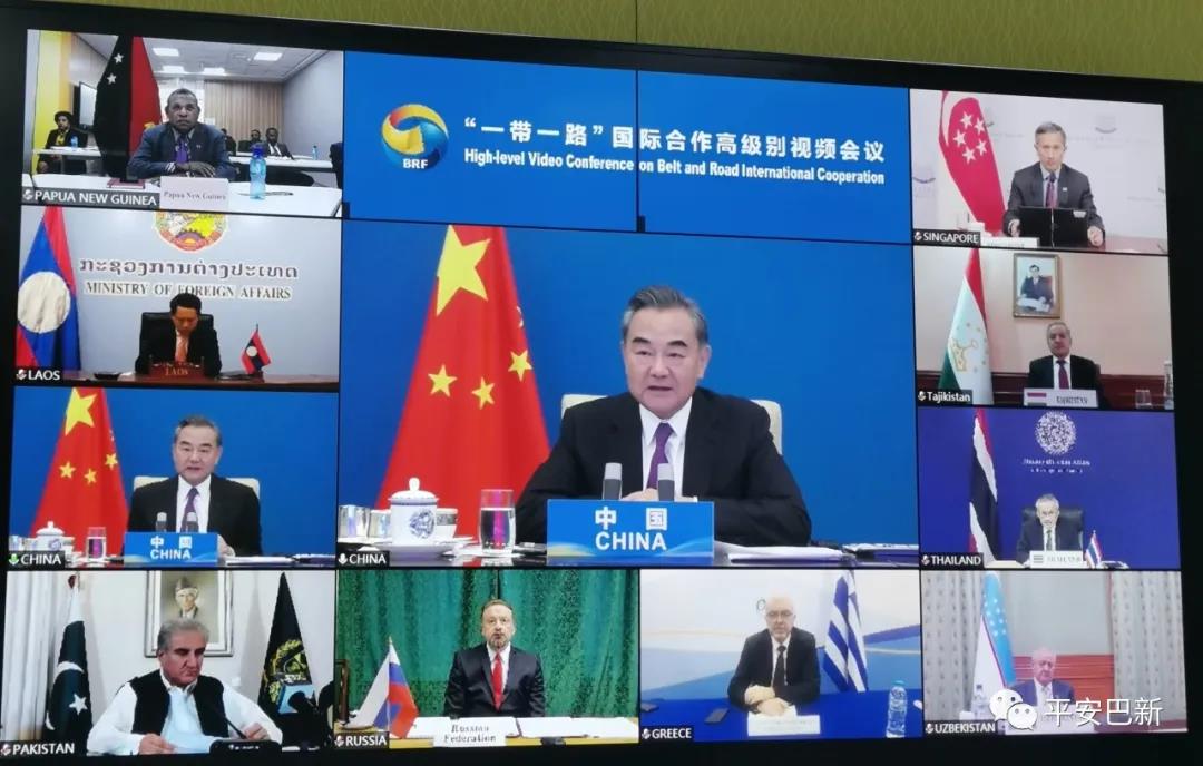 2020年6月18日晚,国务委员兼外交部长王毅在北京主持“一带一路”国际合作高级别视频会议。25个国家的外长或部长级官员及世界卫生组织总干事谭德塞、联合国副秘书长兼联合国开发计划署署长施泰纳与会。巴布亚新几内亚外长普鲁埃奇代表巴新政府参加会议,是太平洋岛国地区唯一受邀代表。