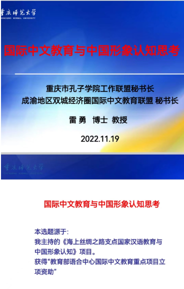 我院雷勇教授受邀做题为《国际中文教育与中国形象认知思考》主旨报告。报告内容为雷勇教授主持的教育部中外语言合作交流中心国际中文教育重点项目《海上丝绸之路支点国家汉语教育与中国形象认知》相关成果。