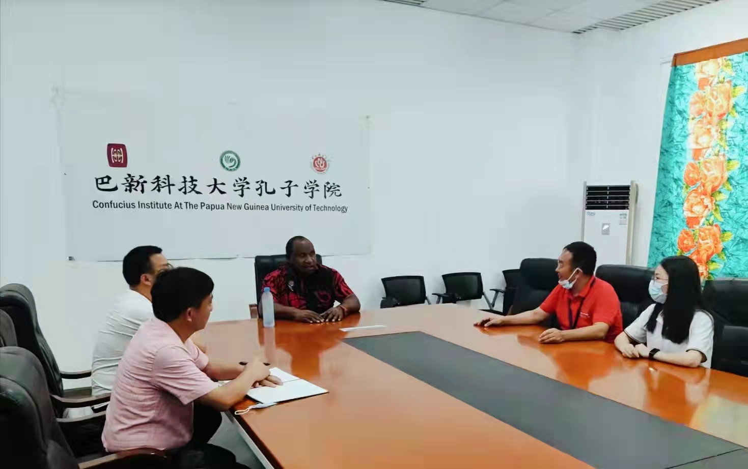 10月29日,巴布亚新几内亚(巴新)科技大学行政副校长PVC Kaul Gena在巴新科大孔子学院张显院长的陪同下到访位于首都的布图卡汉语教学点,与该校两位汉语教师及校领导Florendo Tuguinay等进行了友好交流与沟通。
