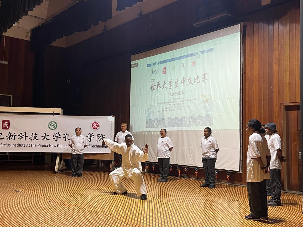 接着,在悠扬美妙的音乐中,身穿白色太极服的孔院学生缓缓走上舞台,向观众表演中国传统功夫——太极。他们动作整齐、步伐沉稳、柔中带刚、精湛的技艺,向观众传递着循序渐进、勇往直前的中国理念。表演赢得了观众的阵阵掌声。