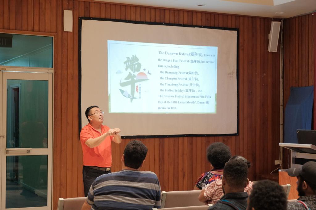 巴新科大孔院外方院长陈国夫首先对前来倾听讲座的各位中文学习者及中文爱好者表示热烈欢迎,并介绍了本次讲座的主要内容安排。孔院老师陈万明对端午节的名称来历、习俗等进行了生动形象的分析,他用视频、图片等方式向大家展示了赛龙舟、包粽子、挂艾草、喝雄黄酒等中国端午习俗。陈万明老师的讲解与剖析让大家对中国的传统的端午节有了直观了解和具体的认识。