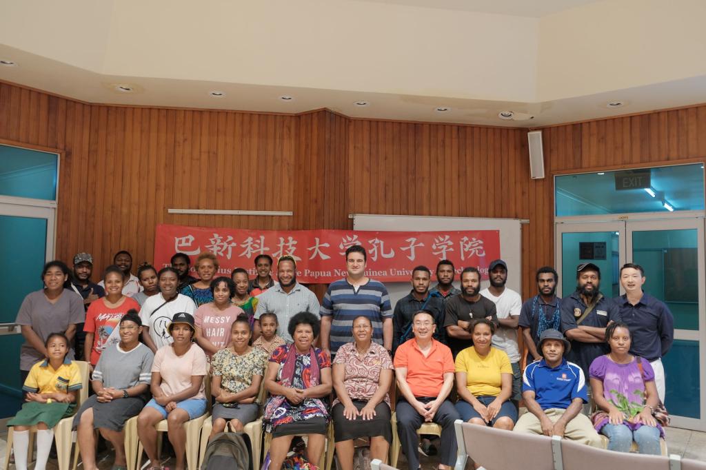 张显院长对讲座进行简洁点评与补充,并就讲座内容面对所有听众进行有奖竞答,对端午节的知识热学热用。在场的同学都踊跃举手抢答,最终一位来自伊朗的外籍同学和两位巴新科技大学的学生获得了小礼物。有奖竞答结束后,张显院长还对端午节的意义、端午节的现代启示等话题进行了深度诠释,他阐释了传统节日的文化内涵及价值观取向,以及中国—巴新两国民族文化的异同,他所讲析的话题获得了同学们的高度赞同。讲座结束后部分师生合影留念。