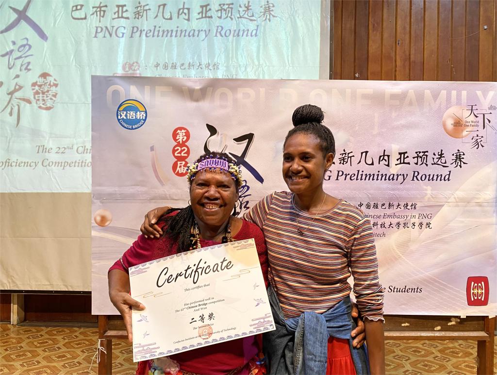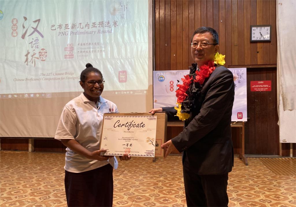 比赛激烈而精彩,掌声不断。经过紧张角逐,4号选手贝思获得本年度“汉语桥”比赛冠军。曾凡华大使亲自为其颁奖。她将代表巴新赛区到中国北京参加“汉语桥”世界大学生中文比赛决赛。