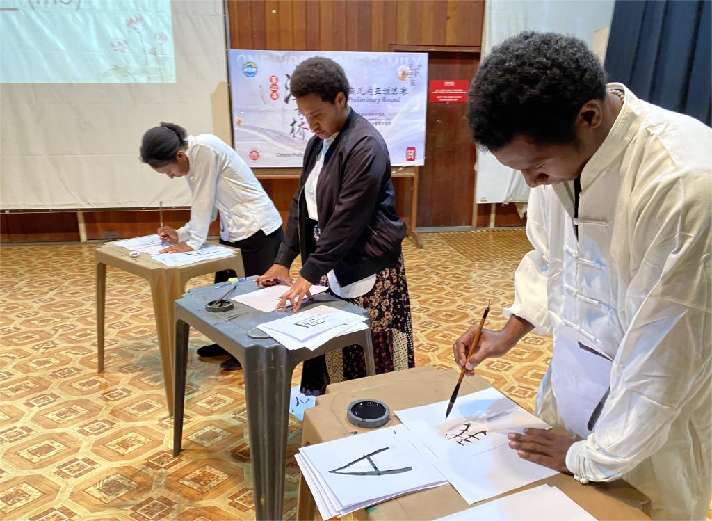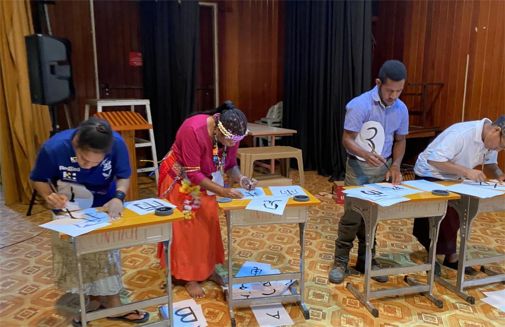 随后,比赛正式开始,使馆随行官员与驻巴新的中资企业代表担任评委。本次比赛主要分为中华文化、汉字书写、汉语演讲以及中华才艺秀四个部分。文化部分通过优美的图片和生动的描述,向观众展示了中华五千年的人文精髓。汉字书写在考察选手的汉字识记能力和书写技巧的同时,也鼓励观众体验认读与书写乐趣。有些同学甚至提前就准备好了纸和笔,比赛期间同选手一起琢磨。通过汉语演讲,选手们不仅展示出高超的汉语应用能力,还表达出对中国和中华文化的热爱。才艺表演则将比赛推向高潮,无论是1号选手郭艳丽的弹唱歌曲《月亮代表我的心》和5号选手司丽文的独唱《童话》,还是2号选手魏静思的舞蹈《妈妈和女儿》,尤其是7号选手罗马硕的武术《太极》,无不激起观众对东方文化的美好憧憬与中巴新命运与共的热切期盼。