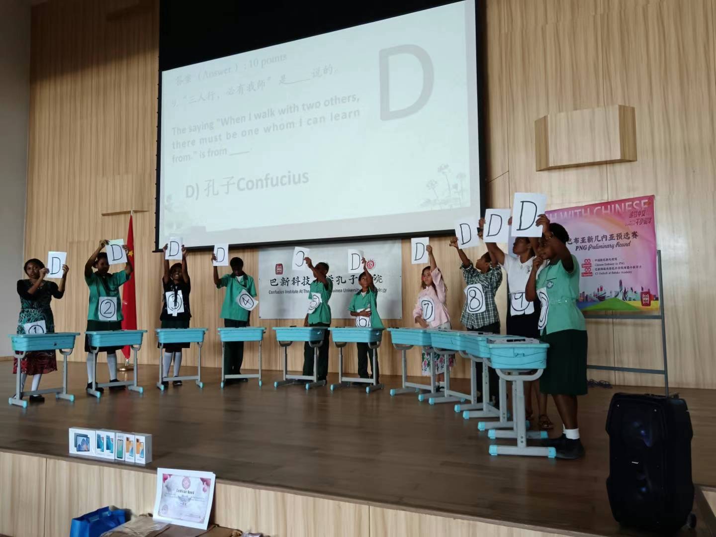 通过紧张而激烈的角逐,7A班学生摘下班级合唱桂冠,3号选手Rose 拔得个人比赛头筹。校董会倪主席和王主任亲自为其颁奖,并亲切地鼓励其他学生继续努力,积极参与此项赛事。本次比赛由中国驻巴新大使馆主办,巴新科大孔院布图卡学园教学点承办。