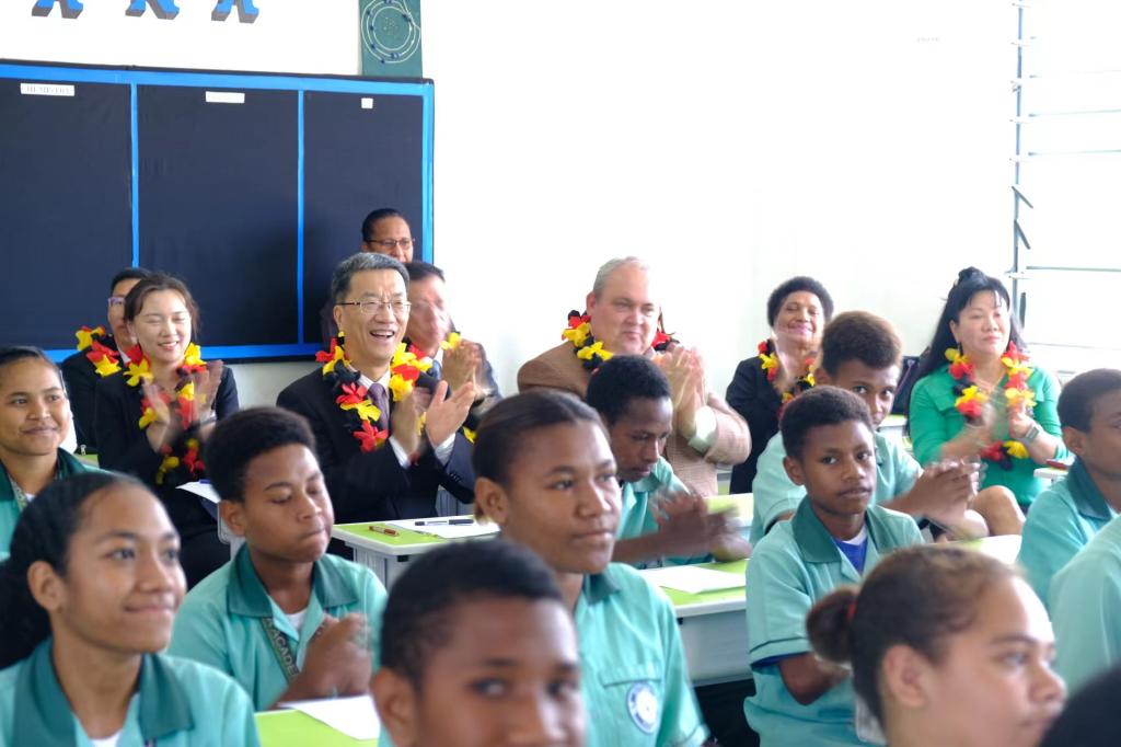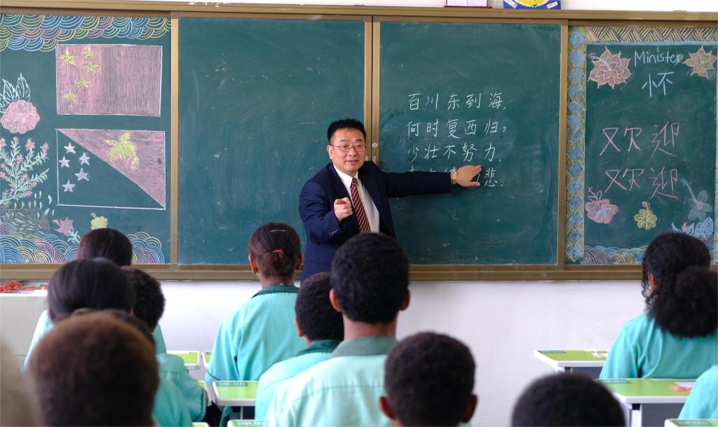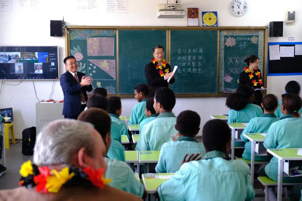 当地时间8月12日上午,正在访问巴布亚新几内亚的中国教育部怀进鹏部长兴致勃勃走进巴新科技大学孔子学院布图卡学园中文课堂。课上张显院长正在给同学们教授中国汉代,汉乐府诗集的《长歌行》最后四句。首先张院长讲解了中文字、词的含义并翻译,在所有学生掌握、理解诗词的真正含义之后,又组织全班进行大声朗诵。通过班级操练、小组比赛、直到最后有同学自告奋勇单独背诵了全首古诗词。在场所有嘉宾、媒体人无不惊叹:教学效率高、教学效果好。