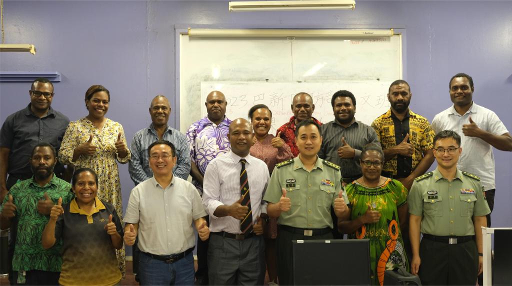 当地时间2023年11月14日下午,在巴布亚新几内亚国防部基地中文教室,一场别开生面的结业仪式正在举行,巴布亚新几内亚国防部第一期中文班学员们成功完成了为期六个月的中文学习课程。巴新国防部国防政策部长Terry Udu、中国驻巴新大使馆国防武官姜湍上校、巴新科技大学孔子学院中方院长张显以及全体参训师生齐聚一堂,见证了这一时刻。