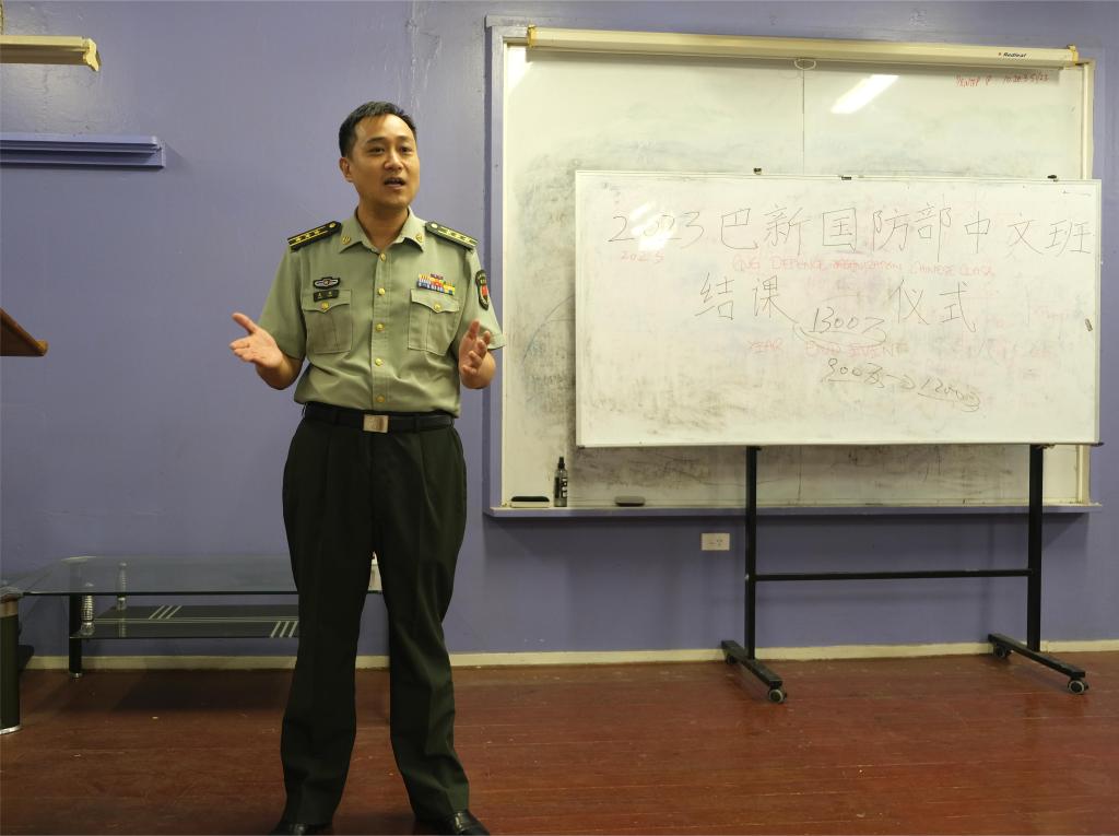 仪式的第三部分是中国驻巴新大使馆国防武官姜湍上校的讲话。他对学员们的学习成果给予高度评价,表示对他们取得的巨大进步感到由衷的肯定和祝贺。姜上校希望学员们通过学习汉语,更好地了解中国,深入学习中国文化和语言,为中巴新两军友谊贡献力量。