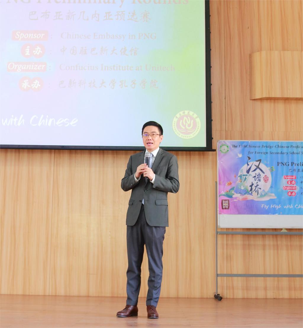 在比赛开始前,陈季良参赞发表了热情洋溢的讲话。陈季良参赞表示:“汉语桥比赛不仅是学习中文的平台,更是中巴新文化交流的重要桥梁。看到这么多巴新学生热爱中文和中华文化,我深感欣慰。希望通过汉语桥的舞台,能够激发大家对中国文化的兴趣,促进中巴新两国人民的相互理解和友谊。”他还强调了学习中文的重要性和对未来中巴新合作的期望,鼓励同学们继续努力学习,成为中巴新友谊的使者。