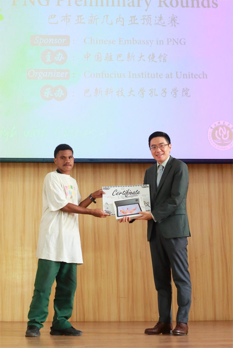 主题演讲结束后,经过激烈的角逐,来自布图卡学园10年级的蒋星宇(WARINGIN JOHN)凭借扎实的中文功底和出色的演唱荣获冠军,来自9年级的乐瑶(FLORIDA PAGAL)和10年级的戚天钺(BINATO SOlOMON)分别获得亚军和季军。他们中的一位将被推荐去往中国,代表巴新参加后续比赛,为国争光。