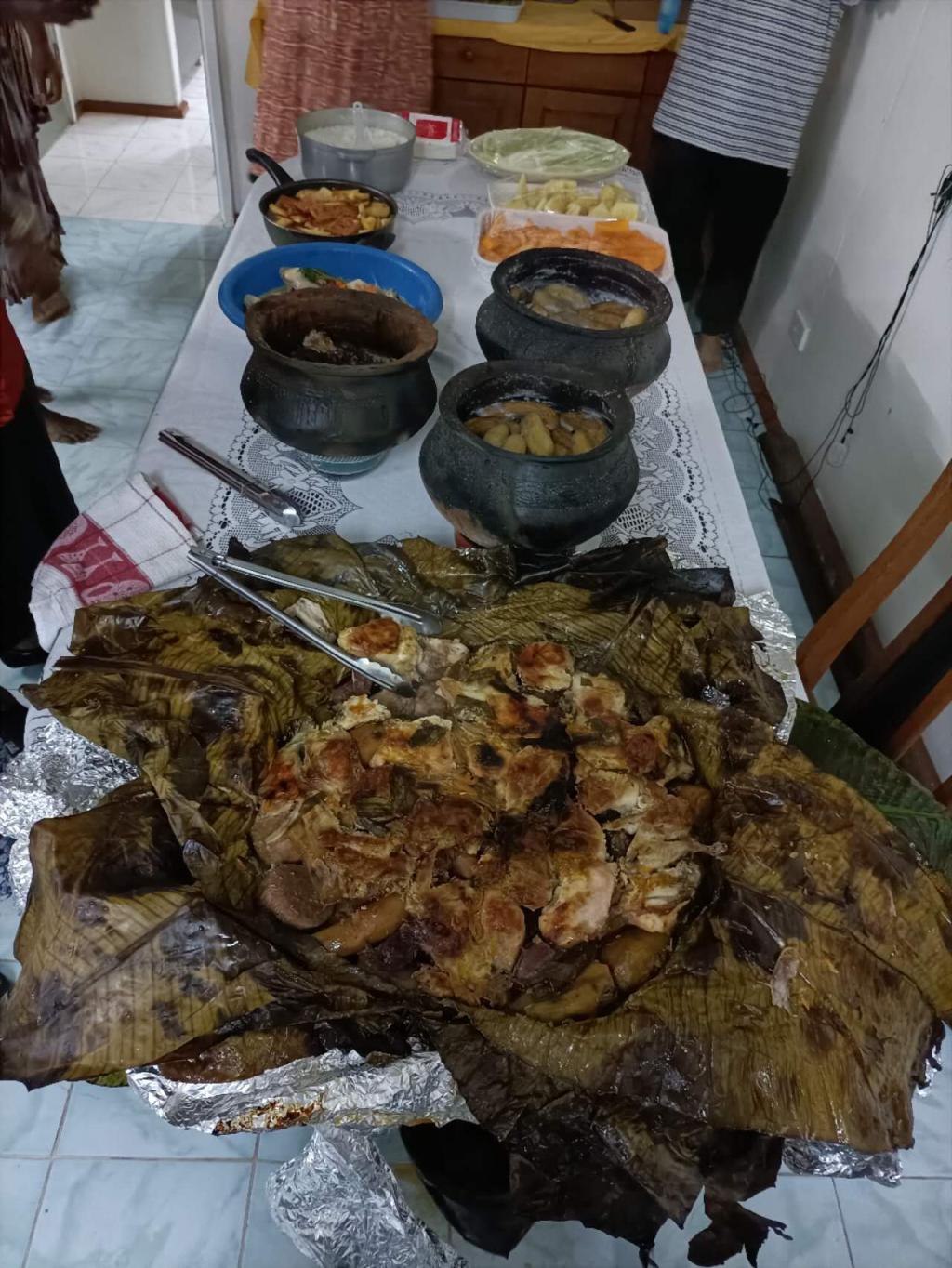 中国火锅及巴新地方美食各自彰显文化特色。孔院教师带去了中国糖果等零食,张显院长则精心烹制了地道的重庆火锅。董事会管理干部们提前几个小时就已经开始制作当地的特色美食,MUMUU (芋头、红薯等加入特殊调料后用现摘的香蕉树叶裹好慢火煨烤),IGIR(鸡肉、红萝卜等放入鲜榨的椰奶中熬煮),还有用最淳朴的烹饪器具CLAY food 炖煮的鸭肉、香蕉等,当然还少不了这里新鲜多汁的各种水果。
