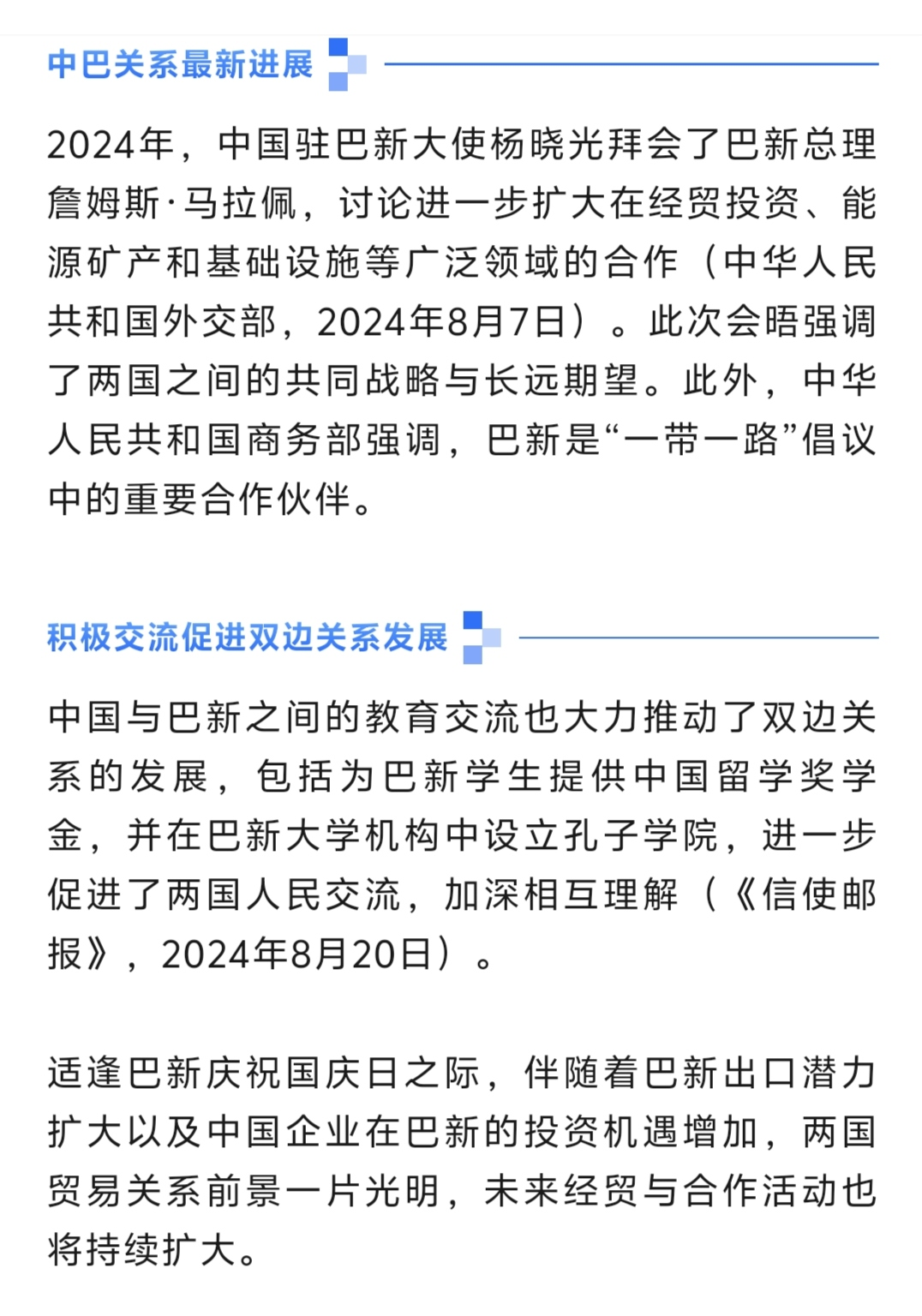 中国驻巴新大使馆刚赴任的杨晓光大使拜会马拉佩总理时,马拉佩总理曾提到巴新科技大学建起了首家孔子学院,为两国间人文交流服务。巴新作为“一带一路”的合作伙伴,需要有更多的人理解中国、懂得中国、学习中国,更好地造福巴新社会和巴新人民。
